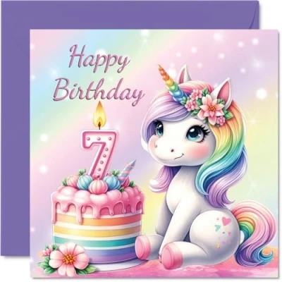 7th Birthday Cards for Girls Unicorn Cake Happy Card 7 Year Old Girl Granddaughter Step Daughter Great Niece Niece, 145mm Bday Greeting