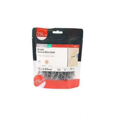 General description Timco Round Wire Nails are designed for general use, featuring a full round head that provides excellent clamping capabilities. These bright nails are self-colored and do not have any plating, ensuring a clean and classic finish. Technical specifications Size: 50 x 2.65 mm Type: Round wire nails Head: Full round head Finish: Bright (self-colored, no plating)