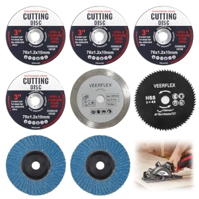 Professional-Grade Precision Cutting Engineered for accuracy, our ultra-thin 1.2mm grinder discs deliver clean, swift cuts through metal, wood, stone, and more. The slim design minimises material waste while boosting efficiency—saving you time and effort on every project. Robust & Long-Lasting Performance Crafted from high-strength stainless steel with double-mesh reinforcement, these cutting discs resist wear and endure high-speed grinding (up to 25,000rpm). The reinforced structure ensures stability, reducing vibration for safer, smoother cuts. Universal Compatibility With a 76mm cutting disc diameter and 10mm arbor, these discs fit most angle grinder cutting discs standards, including pneumatic or lithium-powered tools. Perfect for tradesmen and DIYers tackling diverse materials—from aluminium to cement. Multi-Purpose Disc Pack This versatile set includes 5 specialised angle grinder discs: black/silver for metal/stone/wood, pure black for wood/plastic, and blue for sanding. Ideal for workshops, renovations, or trade jobs requiring adaptability. Convenient Packaging & Safety Tips Each set contains 8 blades: 4 x 76*1.2*10mm cutting disc angle grinders, 2 sanding discs, 1 x angle grinder wood cutting discs, and 1 ceramic blade. Always match the disc to your task and install correctly to ensure safety and efficiency.