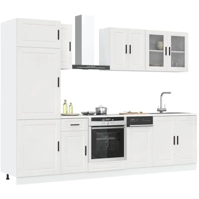 This 8-piece kitchen cabinet set, with its elegant design, optimises your kitchen space and provides ample storage space for your personal belongings! Stable and durable material: Engineered wood is a durable and stable material with a smooth surface that is resistant to moisture, warping, and splitting, making it a reliable choice for a variety of projects.Ample storage space: The kitchen cabinet set has many compartments, and offers sufficient space to store bowls, plates, pots, and other kitchen appliances.Adjustable feet: The bottom cabinets feature adjustable feet that can be adjusted in height to suit your kitchen layout.Easy to maintain: Thanks to its smooth surface, these kitchen cabinets are easy to clean with a damp cloth and require less maintenance. Warning:This product must be secured by installing a worktop. Good to know:Screw(s) and plug(s) for inside the wall are not included. Seek and use screw(s) and plug(s) suitable for your walls. If you are uncertain, seek professional advice. Read and follow each step of the instruction carefully.The worktop, sink and faucet are not included in the delivery.
