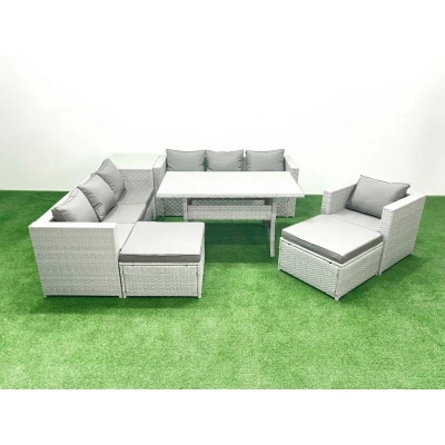 General description This deluxe rattan sofa set is an excellent addition to your patio or garden. It is made of high-quality PE rattan and features a durable galvanized steel construction, ensuring sturdiness and longevity. This furniture set is designed for outdoor use all year round. Technical specifications Set Dimensions: 2 x Sofa with double armrest: 177W x 65D x 66H cm 1 x Armchair: 74L x 65W x 66H cm 1 x Side coffee table: 65L x 65W x 66H cm 2 x Big footstools: 65L x 65W x 34H cm 1 x Rectangular Dining Table: 140L x 80W x 69H cm Color: Light grey mixed rattan with dark grey fabric Installation Items come flat packed and are easy to assemble. Sturdy galvanized steel tube metal frames with powder coating to prevent rust. Usage Low maintenance with removable cushion covers. Easy to move to different locations. Keep cushions indoors or use a rain cover when not in use. Use a rain cover if the furniture is not used for an extended period. Other information 8 cm thick seat cushions