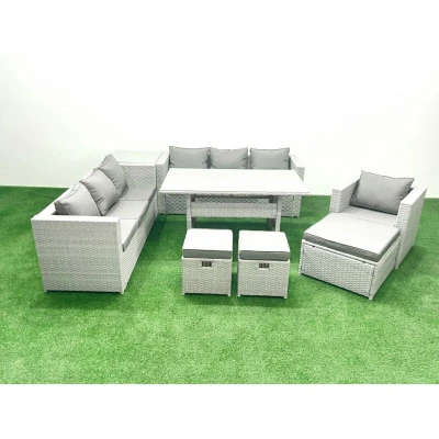 General description This deluxe rattan sofa set is an excellent addition to your patio or garden. It is made of high-quality PE rattan and features a durable galvanized steel construction, ensuring sturdiness and longevity. This furniture set is designed for outdoor use all year round. Technical specifications Set Dimensions: 2 x Sofa with double armrest: 177W x 65D x 66H cm 1 x Armchair: 74L x 65W x 66H cm 1 x Side coffee table: 65L x 65W x 66H cm 1 x Big footstool: 65L x 65W x 34H cm 2 x Fully assembled stools: 40W x 40D x 34H cm 1 x Rectangular dining table: 140L x 80W x 69H cm Color: Light grey mixed rattan with dark grey fabric Installation Items come flat packed and are easy to assemble. Sturdy galvanized steel tube metal frames with powder coating to prevent rust. Usage Low maintenance with removable cushion covers. Easy to move to different locations. Keep cushions indoors or use a rain cover when not in use. Use a rain cover if the furniture is not used for a long time. Other