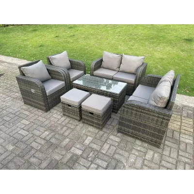 General description This deluxe 8-seater rattan sofa set is an excellent addition to your patio or garden, crafted from high-quality PE rattan and durable galvanized steel. The set includes reclining chairs, a love sofa, a coffee table, and footstools, providing both comfort and style for outdoor gatherings. Technical specifications 2 x Reclining chairs Size: 74W x 69D x 79H cm 2 x Love Sofa Size: 124W x 67D x 79H cm 1 x Coffee Table Size: 105L x 50W x 48H cm 2 Small fully assembled footstools: 40W x 40D x 34H cm Material: Dark grey mixed rattan with dark grey fabric Seat cushion thickness: 8 cm Glass thickness: 5 mm tempered glass Installation Items come flat packed and are easy to assemble. Sturdy galvanized steel tube metal frames with powder coating to prevent rust. Usage The armchairs are adjustable, allowing you to change the backrest inclination from 90° to 130°. Low maintenance with removable cushion covers. Recommended to keep cushions indoors or use a rain cover when not in