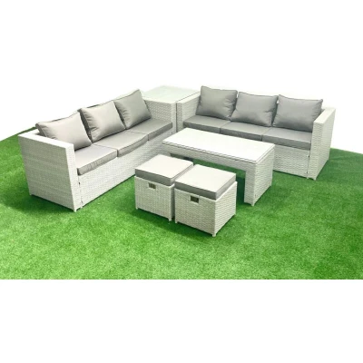 8 Seater Garden Outdoor Rattan Furniture Set Sofa Oblong Coffee Table with 2 Small Footstool Side Light Grey Mixed Fimous