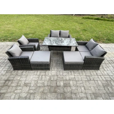 8 Seater High Back Outdoor Garden Furniture Rattan Sofa Dining Table Set with Armchair 2 Big Footstool Dark Grey Mixed Fimous