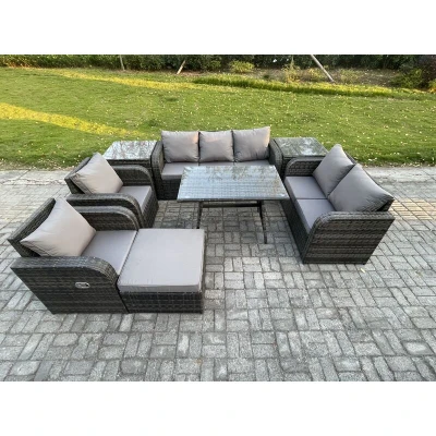 General description This outdoor rattan lounge sofa set is an excellent addition to your patio or garden, crafted from high-quality PE rattan and durable galvanized steel for sturdiness and longevity. It is designed for outdoor use all year round, making it perfect for gatherings with family and friends. Technical specifications Set Dimensions: 2 x Side coffee table: 65L x 65W x 66H cm 1 x Big footstool: 65L x 65W x 34H cm 2 x Reclining Chair: 74W x 67D x 79H cm 1 x Love Sofa: 124W x 67D x 79H cm 1 x 3 Seater Sofa: 177W x 67D x 79H cm 1 x Rectangular Dining Table: 110L x 70W x 70H cm Color: Dark grey mixed rattan with dark grey fabric Seat Cushion Thickness: 8 cm Installation Items come flat packed and are easy to assemble. Includes sturdy galvanized steel tube metal frames with powder coating to prevent rust. Usage The armchairs are adjustable, allowing you to change the inclination of the chair back from 90° to 130° using a button. Low maintenance with removable cushion covers. Keep