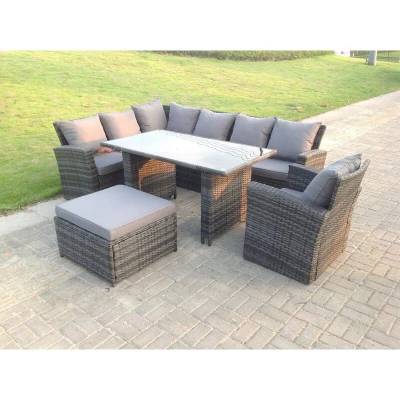 General description This deluxe high back rattan corner sofa set is a great addition to your patio or garden. Made of high-quality PE rattan and durable galvanized steel construction, it offers sturdiness and long-lasting durability, making it suitable for outdoor use all year round. This set is perfect for gathering with family and friends. Technical specifications High Arm Sofa: 167W x 67D x 79H cm Single Arm Sofa: 160L x 67W x 79H cm Oblong Black Tempered Glass Dining Table: 140L x 80W x 70H cm Arm Chair: 74L x 67W x 79H cm Footstool: 65L x 65W x 34H cm Seat Cushion Thickness: 8 cm Material: Dark grey mixed rattan with dark grey fabric Installation Items come flat packed and are easy to assemble. Sturdy galvanized steel tube metal frames with powder coating to prevent rust. Usage Keep the cushions indoors or use a rain cover when not in use. Use a rain cover for the furniture if not used for a long time. Other information Flat PE rattan is completely handmade. 5mm thickness black