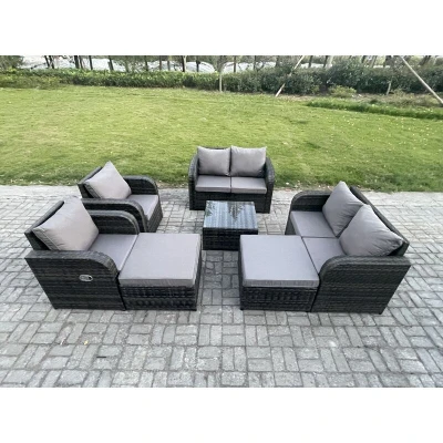 General description This 8-seater deluxe garden furniture set enhances the aesthetic of your courtyard, deck, backyard, porch, or swimming pool. Constructed from high-quality PE rattan and durable galvanized steel, it is designed to withstand adverse weather conditions in the UK. The set can be easily reconfigured to suit your needs at any time. Technical specifications Set includes: 2 x Big footstools: 65L x 65W x 34H cm 2 x Reclining chairs: 74L x 67W x 79H cm 2 x Love sofas: 124W x 67D x 79H cm 1 x Square coffee table: 65L x 65W x 34H cm Color: Dark grey mixed rattan with dark grey fabric Seat cushion thickness: 8 cm Installation Items come flat packed and are easy to assemble. Includes sturdy galvanized steel tube metal frames with powder coating to prevent rust. Usage The reclining chairs are adjustable, allowing you to change the backrest inclination from 90° to 130°. Removable cushion covers for easy maintenance. Recommended to keep cushions indoors or use a rain cover when not