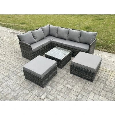 General description This modern deluxe rattan garden furniture set is perfect for various occasions, enhancing any garden, patio, or conservatory. The set includes a corner sofa, a square coffee table, and two big footstools, all designed for comfort and style. Technical specifications Set dimensions: 2 x Big Footstool: 65L x 65W x 34H cm 1 x 3 Seater sofa with double armrest: 162L x 67W x 79H cm (Fully Assembled) 1 x 3 Seater sofa with single armrest: 157L x 67W x 79H cm (Semi-Assembled) 1 x Square Coffee Table: 65L x 65W x 34H cm Material: Dark grey mixed rattan with dark grey fabric Frame: Sturdy galvanized steel tube with powder coating to prevent rust Cushion thickness: 8 cm Glass top: 5 mm thick clear tempered glass with suckers to prevent sliding Installation Items come flat-packed; self-assembly is necessary. Usage Low maintenance; removable cushion covers for easy cleaning. Keep cushions indoors or use a rain cover when not in use. Use a rain cover for the furniture if not in