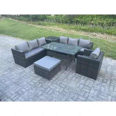 8 Seater Outdoor Lounge Sofa Garden Furniture Set Patio Chair Rattan Rectangular Dining Table with Side Big Footstool Dark Grey Mixed Fimous