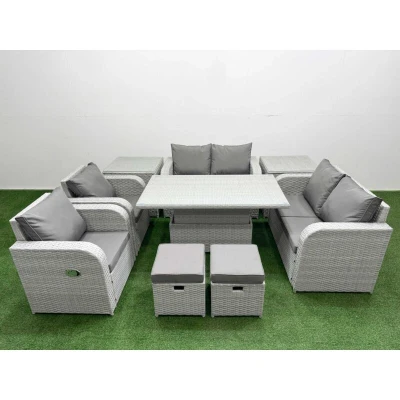 8 Seater Outdoor Reclining Chair Love Sofa Set Rattan Garden Furniture with Adjustable Lifting Dining or Coffee Table 2 Stools Side Light