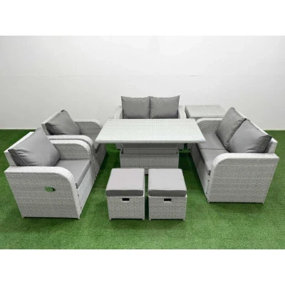 General description This deluxe PE rattan sofa set is a great addition to your patio or garden, made of high-quality PE rattan and durable galvanized steel. The set includes adjustable reclining chairs and a lifting dining or coffee table, providing both comfort and versatility for outdoor gatherings. Technical specifications 2 x Reclining chairs Size: 74W x 69D x 79H cm 2 x Love Sofa Size: 124W x 67D x 79H cm 2 x Fully Assembled Stools: 40W x 40D x 34H cm 1 x Side table: 65L x 65W x 66H cm 1 x Lifting Table Size: 140L x 80W x 68/48H cm (height adjustable: up 68 cm, down 48 cm) Sofa Weight Capacity: 250 kg Table Weight Capacity: 80 kg Color: Light grey rattan with dark grey fabric Installation Items come flat packed and are easy to assemble. Sturdy galvanized steel tube metal frames with powder coating to prevent rust. Usage Adjustable armchairs allow you to change the inclination of the chair back from 90° to 130°. Low maintenance with removable cushion covers. Recommended to keep