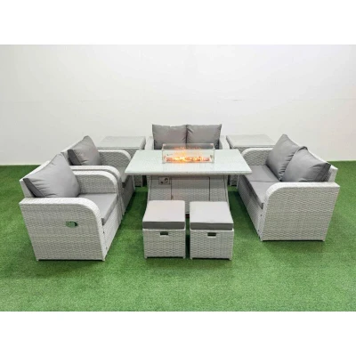 8 Seater Outdoor Reclining Chair Love Sofa Set Rattan Garden Furniture with Firepit Dining Table 2 Stools Side Light Grey Fimous