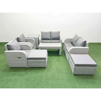 8 Seater Outdoor Reclining Chair Love Sofa Set Rattan Garden Furniture with Oblong Coffee Table 2 Big FootStools Side Light Grey Fimous