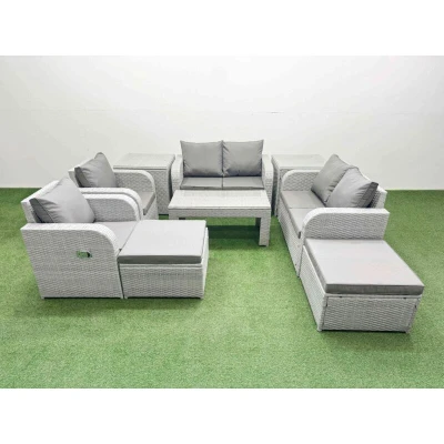General description This deluxe PE rattan sofa set is an excellent addition to your patio or garden, crafted from high-quality PE rattan and durable galvanized steel. The set includes reclining chairs, love sofas, footstools, side tables, and an oblong coffee table, providing both comfort and style for outdoor relaxation. Technical specifications 2 x Reclining chairs: 74W x 69D x 79H cm 2 x Love Sofa: 124W x 67D x 79H cm 2 x Big footstool: 65L x 65W x 34H cm 2 x Side table: 65L x 65W x 66H cm 1 x Table: 105L x 50W x 48H cm Sofa Weight Capacity: 250kg Table Weight Capacity: 80kg Color: Light grey rattan with dark grey fabric Installation Items come flat packed and are easy to assemble. Includes sturdy galvanized steel tube metal frames with powder coating to prevent rust. Usage The 2 armchairs are adjustable, allowing you to change the backrest inclination from 90° to 130°. Low maintenance with removable cushion covers. Recommended to keep cushions indoors or use a rain cover when not