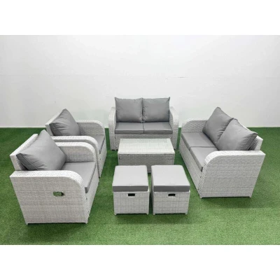 8 Seater Outdoor Reclining Chair Love Sofa Set Rattan Garden Furniture with Rectangular Coffee Table 2 Stools Light Grey Fimous