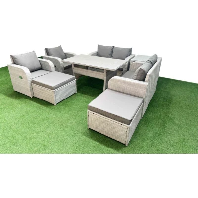 8 Seater Outdoor Reclining Chair Love Sofa Set Rattan Garden Furniture with Rectangular Dining Table 2 Big FootStools Side Light Grey