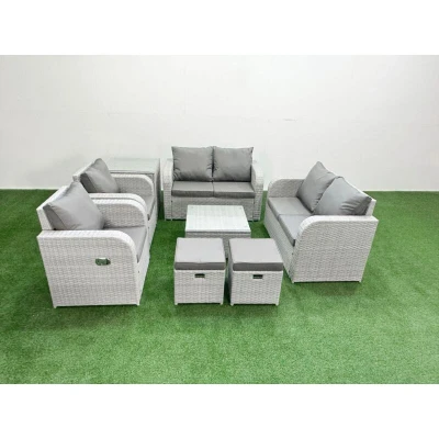 8 Seater Outdoor Reclining Chair Love Sofa Set Rattan Garden Furniture with Square Coffee Table 2 Stools Side Light Grey Fimous