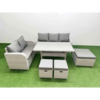 General description This deluxe garden furniture set enhances the aesthetic of your courtyard, deck, backyard, porch, or swimming pool. Constructed from high-quality PE rattan and durable galvanized steel, it is designed to withstand adverse weather conditions in the UK. The set can be easily reconfigured to suit your needs at any time. Technical specifications Love Sofa Size: 124W x 67D x 79H cm 3 Seater Sofa Size: 177W x 67D x 79H cm Big Footstool Size: 65L x 65W x 34H cm Fully Assembled Stools Size: 40W x 40D x 34H cm (2 pieces) Dining Table Size: 140L x 80W x 68H cm Seat Cushion Thickness: 8 cm Material: Light grey PE rattan with dark grey fabric Glass Tabletop: 5mm thickness transparent tempered glass with suckers to prevent sliding Installation Items come flat packed and are easy to assemble. The furniture features sturdy galvanized steel tube frames with powder coating to prevent rust. Usage For low maintenance, the cushion covers are removable. It is recommended to keep the