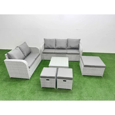 General description This deluxe garden furniture set enhances the aesthetic of your courtyard, deck, backyard, porch, or swimming pool. Constructed from high-quality PE rattan and durable galvanized steel, it is designed to withstand adverse weather conditions in the UK. The set can be easily rearranged into various configurations to suit your needs. Technical specifications Love Sofa Size: 124W x 67D x 79H cm 3-Seater Sofa Size: 177W x 67D x 79H cm Big Footstool Size: 65L x 65W x 34H cm Fully Assembled Stools Size: 40W x 40D x 34H cm (2 pieces) Square Coffee Table Size: 65L x 65W x 34H cm Seat Cushion Thickness: 8 cm Material: Light grey PE rattan with dark grey fabric Glass Tabletop: 5mm thickness transparent tempered glass Installation Items come flat packed and are easy to assemble. Sturdy galvanized steel tube metal frames with powder coating to prevent rust. Usage Low maintenance required. Removable cushion covers for easy cleaning. Keep cushions indoors or use a rain cover when