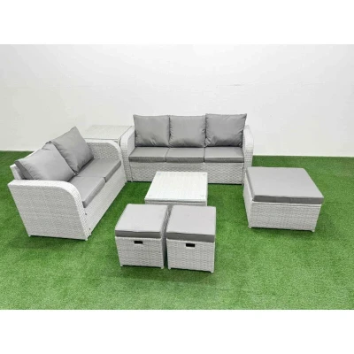 General description This deluxe garden furniture set enhances the aesthetic of your courtyard, deck, backyard, porch, or swimming pool. It is constructed from high-quality PE rattan and durable galvanized steel, designed to withstand adverse weather conditions in the UK. The set can be easily configured into different arrangements to suit your needs. Technical specifications 1 x Love Sofa Size: 124W x 67D x 79H cm 1 x 3 Seater Sofa Size: 177W x 67D x 79H cm 1 x Side Table Size: 65L x 65W x 66H cm 1 x Big Footstool Size: 65L x 65W x 34H cm 2 x Fully Assembled Stools Size: 40W x 40D x 34H cm 1 x Square Coffee Table Size: 65L x 65W x 34H cm Material: Light grey PE rattan with dark grey fabric Seat Cushion Thickness: 8 cm Glass Thickness: 5 mm tempered glass Installation Items come flat packed and are easy to assemble. Includes sturdy galvanized steel tube metal frames with powder coating to prevent rust. Usage Low maintenance required. Removable cushion covers for easy cleaning.