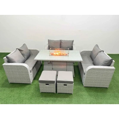 General description This Fimous 8 Seater PE Wicker Rattan Furniture Sofa Set includes a firepit dining table, a 2-seater love sofa, and two stools, all designed for outdoor comfort and style. The set features light grey PE rattan with dark grey fabric, providing a modern aesthetic for your patio or garden. Technical specifications 3 x Love Sofa Size: 124W x 67D x 79H cm 2 x Fully Assembled Stools: 40W x 40D x 34H cm 1 x Firepit Dining Table Size: 140L x 80W x 69H cm Seat Cushion Thickness: 8 cm Material: Light grey PE rattan with dark grey fabric Frame: Sturdy galvanized steel tube with powder coating to prevent rust Glass: 5mm thickness transparent tempered glass Installation Items come flat packed and are easy to assemble. Usage Place the gas fire pit on the glass top, not under it, and avoid covering the igniter with lava rocks. Check for any gas leaks at the joints or hose before use. Keep cushions indoors or use a rain cover when not in use. Use a 5 kg gas tank for optimal