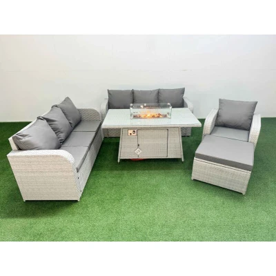 General description This Fimous 8 Seater Poly Rattan Outdoor Garden Furniture Set includes a firepit dining table, a 3-seater sofa, reclining chairs, and a big footstool, all designed for comfort and style in your outdoor space. The set features light grey rattan with dark grey fabric, providing a modern look that complements any patio or garden setting. Technical specifications Reclining chair dimensions: 74W x 69D x 79H cm 3-seater sofa dimensions: 177W x 67D x 79H cm (2 units) Big footstool dimensions: 65L x 65W x 34H cm Firepit dining table dimensions: 140L x 80W x 69H cm Sofa weight capacity: 250 kg Table weight capacity: 80 kg Seat cushion thickness: 8 cm Material: Flat PE rattan, galvanized steel tube frames with powder coating Glass top: 5 mm thick transparent tempered glass Installation Items come flat packed and are easy to assemble. Ensure to check all parts before assembly. Usage For optimal safety and performance, place the gas fire pit on the glass top of the table, not