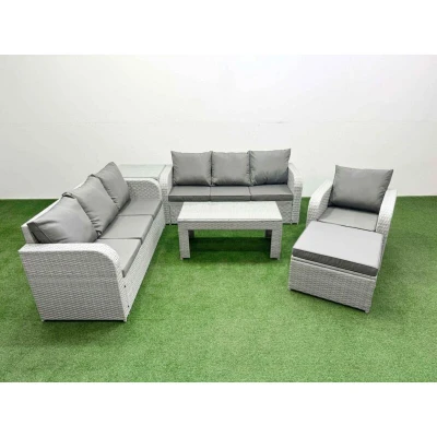 General description This deluxe PE rattan sofa set is a great addition to your patio or garden, made of high-quality PE rattan and durable galvanized steel. The set includes a reclining chair, two 3-seater sofas, a big footstool, a side table, and a coffee table, all designed for comfort and style. Technical specifications Reclining chair size: 74W x 69D x 79H cm 3-seater sofa size: 177W x 67D x 79H cm (2 units) Big footstool size: 65L x 65W x 34H cm Side table size: 65L x 65W x 66H cm Coffee table size: 105L x 50W x 48H cm Sofa weight capacity: 250 kg Table weight capacity: 80 kg Seat cushion thickness: 8 cm Tempered glass thickness: 5 mm Installation Items come flat packed and are easy to assemble. Usage Low maintenance; removable cushion covers for easy cleaning. Keep cushions indoors or use a rain cover when not in use. Use a rain cover for the furniture if not in use for an extended period. Other information Adjustable armchairs with a back inclination range of 90°-130°. Sturdy