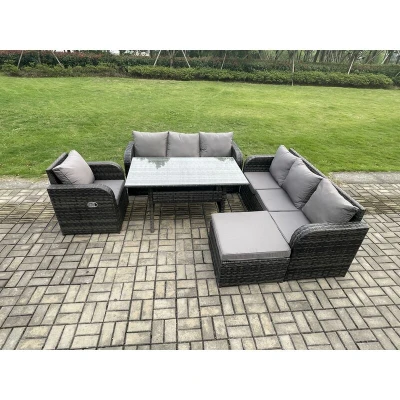 8 Seater Rattan Garden Furniture Set Oblong Rectangular Dining Table and Chairs with 3 Sofa Big Footstool Dark Grey Mixed Fimous