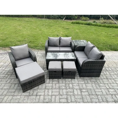 8 Seater Rattan Outdoor Garden Furniture Sofa Set Patio Table & Chairs with Side 3 Footstools Dark Grey Mixed Fimous