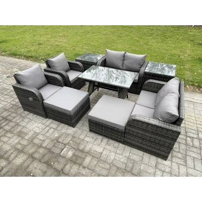 General description This 8 Seater PE rattan outdoor furniture set is an excellent addition to your patio or garden. It is constructed from high-quality PE rattan and durable galvanized steel, ensuring sturdiness and longevity. This garden furniture set is designed for outdoor use all year round. Technical specifications Set Dimensions: 2 x Side coffee table: 65L x 65W x 66H cm 2 x Big footstool: 65L x 65W x 34H cm 2 x Reclining Chair: 74W x 67D x 79H cm 2 x Love Sofa: 124W x 67D x 79H cm 1 x Rectangular Dining Table: 110L x 70W x 70H cm Color: Dark grey mixed rattan with dark grey fabric Seat Cushion Thickness: 8 cm Installation Items come flat packed and are easy to assemble. The sturdy galvanized steel tube frames are powder-coated to prevent rust. Usage The armchairs are adjustable, allowing you to change the backrest inclination from 90° to 130° using a button. The set features low maintenance requirements, with removable cushion covers for easy cleaning. It is recommended to keep