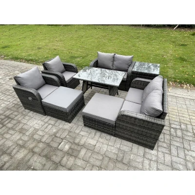 General description This 8 Seater PE rattan outdoor furniture set is an excellent addition to your patio or garden. It is made of high-quality PE rattan and features a durable galvanized steel construction, ensuring sturdiness and longevity. This garden furniture set is designed for outdoor use all year round. Technical specifications Set Dimensions: 1 x Side coffee table: 65L x 65W x 66H cm 2 x Big footstool: 65L x 65W x 34H cm 2 x Reclining Chair: 74W x 67D x 79H cm 2 x Love Sofa: 124W x 67D x 79H cm 1 x Rectangular Dining Table: 110L x 70W x 70H cm Color: Dark grey mixed rattan with dark grey fabric Seat Cushion Thickness: 8 cm Installation Items come flat packed and are easy to assemble. The furniture features sturdy galvanized steel tube frames with powder coating to prevent rust. Usage The armchairs are adjustable, allowing you to change the backrest inclination from 90° to 130° using a button. The set includes removable cushion covers for easy maintenance. It is recommended to
