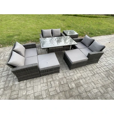 General description This Fimous 8 Seater Wicker PE Rattan Garden Furniture Set is designed for outdoor use, featuring high-quality PE rattan and a durable galvanized steel construction that ensures sturdiness and longevity. Its elegant design combines country chic with modern minimalism, making it a stylish addition to any patio or balcony. Technical specifications Set Dimensions: Side coffee table: 65L x 65W x 66H cm Big footstools (2): 65L x 65W x 34H cm 2 Seater sofas (3): 124L x 70W x 74H cm Rectangular Dining Table: 140L x 80W x 69H cm Seat cushion thickness: 8 cm Clear tempered glass thickness: 5 mm Installation The furniture set comes flat-packed and requires self-assembly. Sturdy galvanized steel tube metal frames are powder-coated to prevent rust. Usage This outdoor furniture set is low maintenance, featuring removable cushion covers for easy cleaning. It is advisable to keep the cushions indoors or use a rain cover when not in use. Additionally, cover the furniture with a