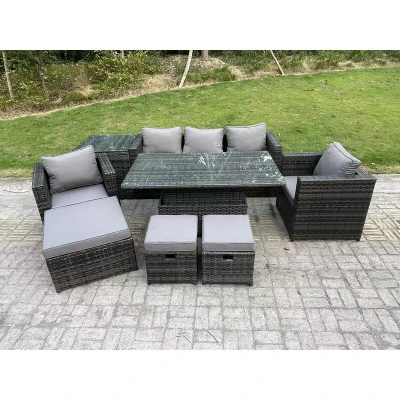 This deluxe rattan rising sofa dining set is a great addition to patio or garden, made of high quality PE rattan and durable galvanized steel construction for sturdiness and long lasting.Durability ,and can be put outdoor all year round. Set Dimensions: • 1 x Sofa with double armrest: 177W x 65D x 66H cm • 2 x Arm chairs size: 74L x 65W x 66H CM • 1 x PC Rising dining table: 140L x 80W x 68/48H cm (height up 68, down 48) • 1 x Side coffee table :65L x 65W x 66H cm • 2 x Small fully assembled footstools :40L x 40W x 34H cm • 1 x Big footstool :65L x 65W x 34H cm Dark grey mixed rattan with dark grey fabric .Color may some difference due to light or monitor .we are unable to return the item due to color problem. Table Can Be Used Both For Coffee Or Dining Table,Cheap Price Compared With Other On Or Offline Store For Rising Table Set Items Comes Flat Packed And Easy Assemble,Sturdy Galvanized Steel Tube Metal Frames With Powder Coating To Prevent The Rust Flat PE Rattan Completely Made
