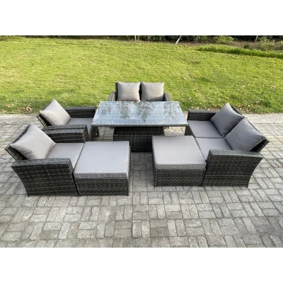 8 Seater Wicker Rattan Garden Furniture Rising Table Set with 2 Big Footstool Double Seat Sofa Armchairs Dark Grey Mixed Fimous