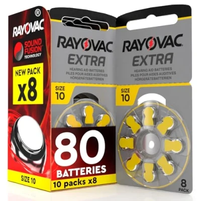 Kit contains: 80 Rayovac Size 10 hearing aid batteries Air zinc type, voltage 1.45V, capacity 105 mAh and mercury-free Battery that guarantees reliability and constant performance, providing lasting power for even the most modern and demanding devices Designed for greater cell stability over a wide temperature range, Sound Fusion technology provides even more consistent power Optimised material concentration and innovative mixing method improve anodic efficiency and help get the most out of each individual stack