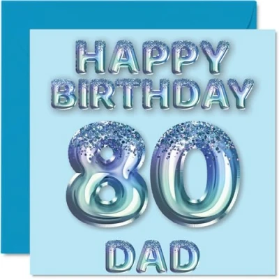 MAKE YOUR DAD SMILE WITH THIS AWESOME BIRTHDAY CARD: This exceptional quality birthday card for him shows the design of blue glitter balloons stating 'Happy Birthday 80' Dad'. If you are looking for funny birthday cards for men, then then this happy birthday card is bound to make them laugh. Not just for friendship gifts for men this could also be for Dad, Step Dad or Father in Law. WHAT DO YOU GET: The card is printed on one side and BLANK ON THE INSIDE to allow you to write your very own message. The unique fun design is printed on a specially sourced and environmentally responsible board. At 360 microns thick the natural white one-sided gloss board has a quality look and feel. Supplied with a coloured gummed envelope to complement the design and ready to be sealed and sent in the post. Birthday card for Dad, 80th birthday card for him. NO INK SMUDGES: There is nothing worse than writing inside a card to find that the shiny surface makes the ink smudge. This is why we use a high quality one sided coated board. The uncoated side will absorb more of the ink from your pen to make smudging a thing of the past. Dad birthday cards, birthday card cute, 80th birthday gifts for Dad, Dad birthday cards. SIZES: Greeting Card = 145mm x 145mm, Envelope = 155mm x 155mm, Card Thickness = 360 micron. Great Dad birthday cards from Daughter and Son, male birthday card, 80th birthday card, happy birthday Dad cards, family birthday card. MADE AND QUALITY CHECKED IN THE UK: We print and manufacture all our product right her in the UK so you can be sure of a fast turnaround and a product that is expertly made. Using environmentally responsible premium board our card is conscious of the responsible management of the world's forests.