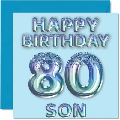 MAKE YOUR SON SMILE WITH THIS AWESOME BIRTHDAY CARD: This exceptional quality birthday card for him shows the design of blue glitter balloons stating 'Happy Birthday 80' Son'. If you are looking for funny birthday cards for men, then then this happy birthday card is bound to make them laugh. Not just for friendship gifts for men this could also be for Son, Step Son or Son in Law. WHAT DO YOU GET: The card is printed on one side and BLANK ON THE INSIDE to allow you to write your very own message. The unique fun design is printed on a specially sourced and environmentally responsible board. At 360 microns thick the natural white one-sided gloss board has a quality look and feel. Supplied with a coloured gummed envelope to complement the design and ready to be sealed and sent in the post. Birthday card for Son, 80th birthday card for him. NO INK SMUDGES: There is nothing worse than writing inside a card to find that the shiny surface makes the ink smudge. This is why we use a high quality one sided coated board. The uncoated side will absorb more of the ink from your pen to make smudging a thing of the past. Son birthday cards, birthday card cute, 80th birthday gifts for Son, Son birthday cards. SIZES: Greeting Card = 145mm x 145mm, Envelope = 155mm x 155mm, Card Thickness = 360 micron. Great Son birthday cards from Dad and Mum, male birthday card, 80th birthday card, happy birthday Son cards, family birthday card. MADE AND QUALITY CHECKED IN THE UK: We print and manufacture all our product right her in the UK so you can be sure of a fast turnaround and a product that is expertly made. Using environmentally responsible premium board our card is conscious of the responsible management of the world's forests.
