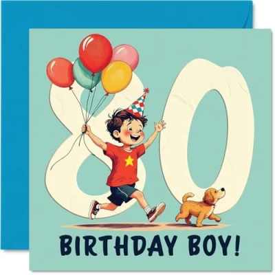 80th Birthday Cards for Men Balloon Boy Happy Card 80 Year Old Man Uncle Grandad in Law Step Dad, 145mm Bday Greeting
