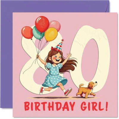 80th Birthday Cards for Women Balloon Girl Happy Card 80 Year Old Woman Granny Nan Nanny Nana, 145mm Bday Greeting