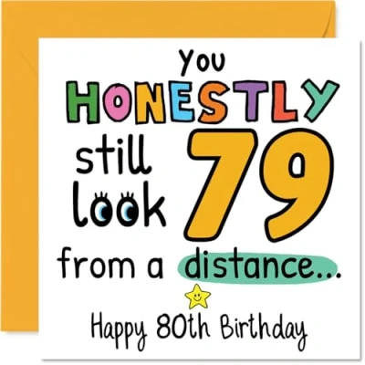 MAKE THEM SMILE WITH THIS UNIQUE BIRTHDAY CARD: This exceptional quality birthday card for him or her shows the design 'You Honestly still look 79 from a distance Happy 80th Birthday'. If you are looking for special birthday greetings cards for Men birthday card then then this happy birthday card is bound to make them smile. Not just for birthday gifts for Men this could also be for Auntie, Nanny, Nan, Uncle, Dad, Wife, Grandma or Husband. WHAT DO YOU GET: The card is printed on one side and BLANK ON THE INSIDE to allow you to write your very own message. The unique fun design is printed on a specially sourced and environmentally responsible board. At 360 microns thick the natural white one-sided gloss board has a quality look and feel. Supplied with a coloured gummed envelope to complement the design and ready to be sealed and sent in the post. Great Auntie birthday cards, Nanny birthday card. NO INK SMUDGES: There is nothing worse than writing inside a card to find that the shiny surface makes the ink smudge. This is why we use a high quality one sided coated board. The uncoated side will absorb more of the ink from your pen to make smudging a thing of the past. 80th Birthday card for Nan, 80th Birthday card for Uncle, 80th Birthday card for Dad. SIZES: Greeting Card = 145mm x 145mm, Envelope = 155mm x 155mm, Card Thickness = 360 micron. Wife 80th birthday card, birthday cards for Grandma, special birthday cards for Husband, 80th birthday card Auntie, Nanny 80th birthday card. MADE AND QUALITY CHECKED IN THE UK: We print and manufacture all our products right here in the UK so you can be sure of a fast turnaround and a product that is expertly made. Using environmentally responsible premium board our card is conscious of the responsible management of the world's forests - perfect birthday cards for Men, fun birthday cards for him, Nanny 80th birthday cards, female birthday cards.