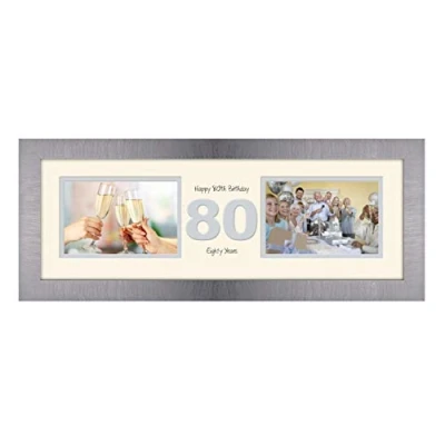 80th Birthday Photo Frame Eightieth Gift Takes Two 6x4 Landscape Photos 1229A (Brushed Silver Finish Cream Mount Grey Inside)