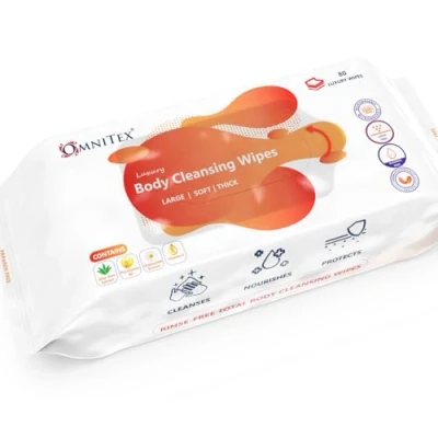 Omnitex Luxury, Thick Full Body Cleansing Wipes. Microveable, Thick & Large with a Honeycomb Texture to offer a softer, luxurious and more hygienic clean. Ideal wipe size to use one wipe for each area of the body : Face, Neck, Chest, Arms, Perineum, Legs, Back & Buttocks. Added Herbal extracts & Vitamins cleanses, nourishes & protects. Lightly fragranced, medical grade premium thick soft cloth-like fabric and generous amounts of cleaning solution provides the user a safe & enhanced cleansing. Dermatologically Tested. Latex Free, Alcohol Free, Parabens Free. ISO9001 registered supplier Pack of 80 wipes