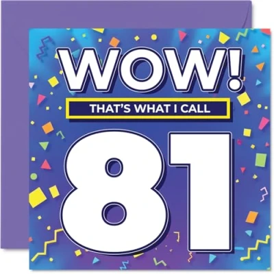 MAKE THEM SMILE WITH THIS UNIQUE BIRTHDAY CARD: This exceptional quality birthday card for him or her shows the design 'Wow! That?s What I Call 81'. If you are looking for special birthday greetings cards for Men birthday card then then this happy birthday card is bound to make them smile. Not just for birthday gifts for Men this could also be for Nanny, Grandad, Auntie, Uncle, Wife, Husband, Dad or Grandma. WHAT DO YOU GET: The card is printed on one side and BLANK ON THE INSIDE to allow you to write your very own message. The unique fun design is printed on a specially sourced and environmentally responsible board. At 360 microns thick the natural white one-sided gloss board has a quality look and feel. Supplied with a coloured gummed envelope to complement the design and ready to be sealed and sent in the post. Great Nanny birthday cards, Grandad birthday card. DESIGNED FOR WRITING: There is nothing worse than writing inside a card to find that the shiny surface makes the ink smudge. This is why we use a high quality one sided coated board. The uncoated side will absorb more of the ink from your pen to make smudging a thing of the past. 81st Birthday card for Auntie, 81st Birthday card for Uncle, 81st Birthday card for Wife. SIZES: Greeting Card = 145mm x 145mm, Envelope = 155mm x 155mm, Card Thickness = 360 micron. Husband 81st birthday card, birthday cards for Dad, special birthday cards for Grandma, 81st birthday card Nanny, Grandad 81st birthday card. MADE AND QUALITY CHECKED IN THE UK: We print and manufacture all our products right here in the UK so you can be sure of a fast turnaround and a product that is expertly made. Using environmentally responsible premium board our card is conscious of the responsible management of the world's forests - perfect birthday cards for Men, fun birthday cards for him, Grandad 81st birthday cards, female birthday cards.