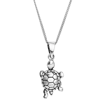 Embrace the allure of the ocean with our Sterling Silver Sea Turtle Pendant Curb Chain Necklace, a fashionable and trendy piece that captures the essence of sea life. Experience the craftsmanship of fine quality 925 silver jewellery that offers both elegance and playful charm.. 25 sterling silver pendant necklace.. Charm width 10 mm. Chain length 45 cm. Weight 1.36 grams.. All our 925 sterling silver pendants come with a 925 silver curb chain.. The chain has a spring ring clasp.. Our solid silver necklaces look great layered with other necklaces.. 100% genuine sterling silver containing 92.5% by weight of silver - this jewellery is both hypoallergenic and nickel free.