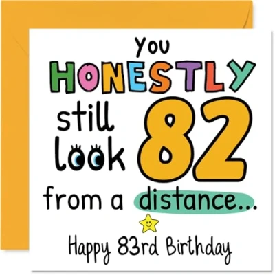 MAKE THEM SMILE WITH THIS UNIQUE BIRTHDAY CARD: This exceptional quality birthday card for him or her shows the design 'You Honestly still look 82 from a distance Happy 83rd Birthday'. If you are looking for special birthday greetings cards for Men birthday card then then this happy birthday card is bound to make them smile. Not just for birthday gifts for Men this could also be for Uncle, Dad, Wife, Grandma, Husband, Grandad, Auntie or Nanny. WHAT DO YOU GET: The card is printed on one side and BLANK ON THE INSIDE to allow you to write your very own message. The unique fun design is printed on a specially sourced and environmentally responsible board. At 360 microns thick the natural white one-sided gloss board has a quality look and feel. Supplied with a coloured gummed envelope to complement the design and ready to be sealed and sent in the post. Great Uncle birthday cards, Dad birthday card. NO INK SMUDGES: There is nothing worse than writing inside a card to find that the shiny surface makes the ink smudge. This is why we use a high quality one sided coated board. The uncoated side will absorb more of the ink from your pen to make smudging a thing of the past. 83rd Birthday card for Wife, 83rd Birthday card for Grandma, 83rd Birthday card for Husband. SIZES: Greeting Card = 145mm x 145mm, Envelope = 155mm x 155mm, Card Thickness = 360 micron. Grandad 83rd birthday card, birthday cards for Auntie, special birthday cards for Nanny, 83rd birthday card Uncle, Dad 83rd birthday card. MADE AND QUALITY CHECKED IN THE UK: We print and manufacture all our products right here in the UK so you can be sure of a fast turnaround and a product that is expertly made. Using environmentally responsible premium board our card is conscious of the responsible management of the world's forests - perfect birthday cards for Men, fun birthday cards for him, Dad 83rd birthday cards, female birthday cards.