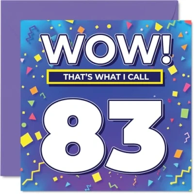 MAKE THEM SMILE WITH THIS UNIQUE BIRTHDAY CARD: This exceptional quality birthday card for him or her shows the design 'Wow! That?s What I Call 83'. @@@z3atk984bLtK9ONaAcY2C8ciKXqhthn7@@@ you are looking for special birthday greetings cards for Men birthday card then then this happy birthday card is bound to make them smile. Not just for birthday gifts for Men this could also be for Auntie, Uncle, Wife, Husband, Dad, Grandma, Nan or Nanny. WHAT DO YOU GET: The card is printed on one side and BLANK ON THE INSIDE to allow you to write your very own message. The unique fun design is printed on a specially sourced and environmentally responsible board. At 360 microns thick the natural white one-sided gloss board has a quality look and feel. Supplied with a coloured gummed envelope to complement the design and ready to be sealed and sent in the post. Great Auntie birthday cards, Uncle birthday card. DESIGNED FOR WRITING: There is nothing worse than writing inside a card to find that the shiny surface makes the ink smudge. This is why we use a high quality one sided coated board. The uncoated side will absorb more of the ink from your pen to make smudging a thing of the past. 83rd Birthday card for Wife, 83rd Birthday card for Husband, 83rd Birthday card for Dad. SIZES: Greeting Card = 145mm x 145mm, Envelope = 155mm x 155mm, Card Thickness = 360 micron. Grandma 83rd birthday card, birthday cards for Nan, special birthday cards for Nanny, 83rd birthday card Auntie, Uncle 83rd birthday card. MADE AND QUALITY CHECKED IN THE UK: We print and manufacture all our products right here in the UK so you can be sure of a fast turnaround and a product that is expertly made. Using environmentally responsible premium board our card is conscious of the responsible management of the world's forests - perfect birthday cards for Men, fun birthday cards for him, Uncle 83rd birthday cards, female birthday cards.