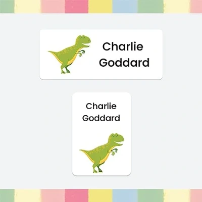 86 x Personalised Stick On Waterproof Washable Name Labels Pack of 2 Sizes for Clothes, Water Bottles, School Uniform, Equipment, Shoes, School, Nursery, Day Care Dinosaur (SFP)