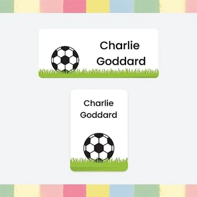 86 x Personalised Stick On Waterproof Washable Name Labels Pack of 2 Sizes for Clothes, Water Bottles, School Uniform, Equipment, Shoes, School, Nursery, Day Care Football (SFP)