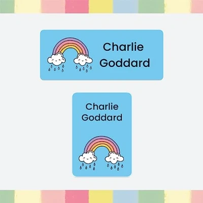 86 x Personalised Stick On Waterproof Washable Name Labels Pack of 2 Sizes for Clothes, Water Bottles, School Uniform, Equipment, Shoes, School, Nursery, Day Care Rainbow (SFP)